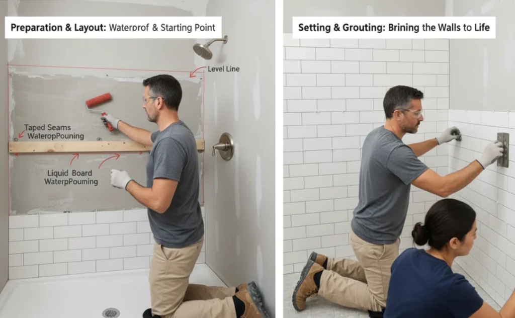 - How to Install Wall Tile & Showers: In wet areas like showers, the wall substrate must be cement backer board or another waterproofing-approved panel. A liquid-applied or sheet waterproofing membrane must be applied to the substrate before any tile setting begins. For a shower floor, you must first create a pre-slope, then apply a final waterproofing layer, and then build a final mortar bed that slopes 1/4 inch per foot toward the drain to ensure proper drainage.