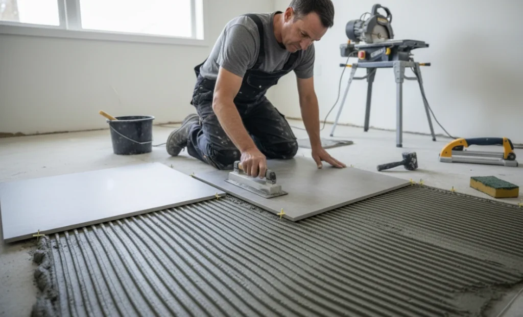 - Back-Butter Large Tiles: For large-format tiles (12” x 12” and up), apply a thin layer of thin-set to the back of the tile in addition to the mortar on the floor. This technique, known as back-buttering, ensures 90–95% mortar coverage for maximum adhesion and structural integrity.